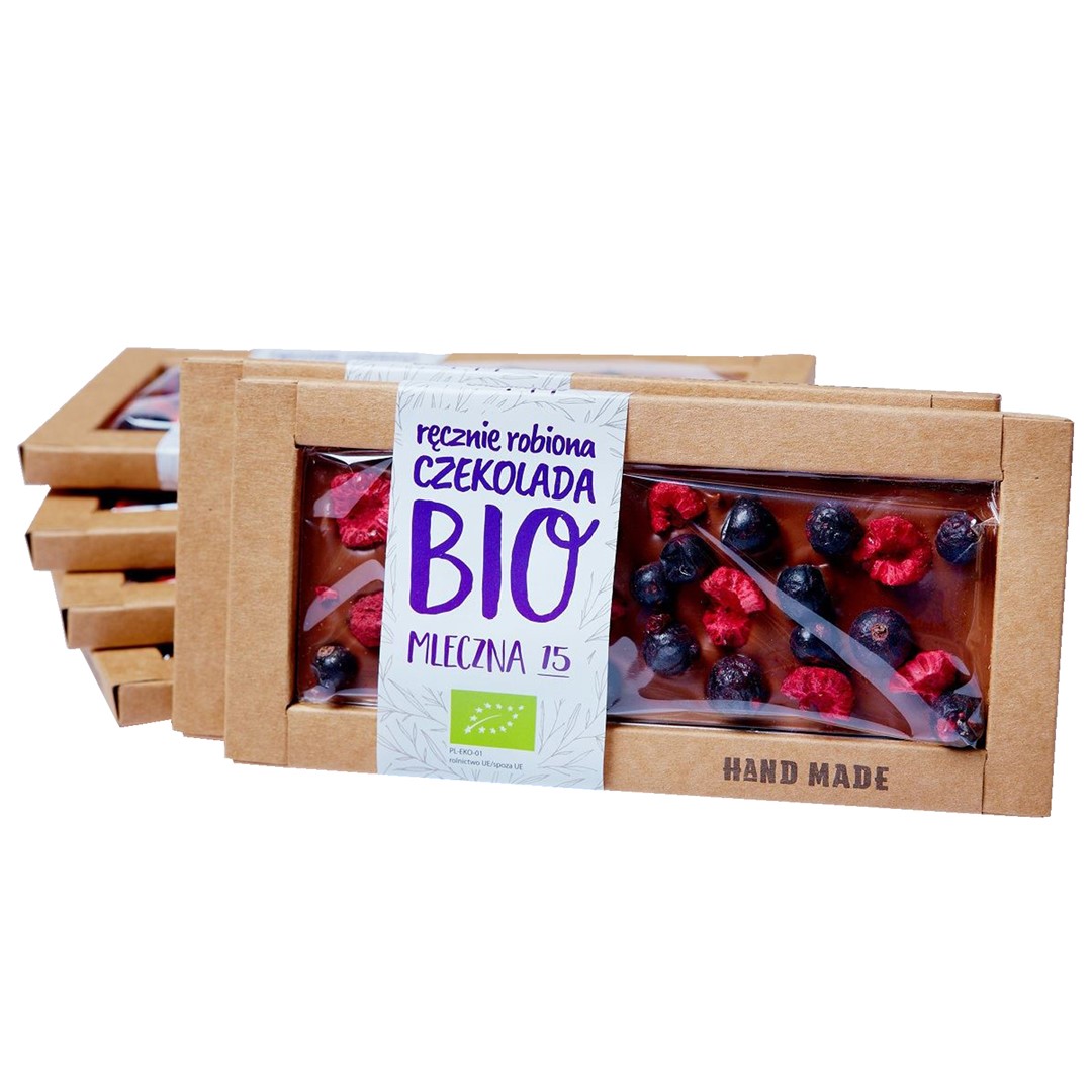 czekolada mleczna* (cukier trzcinowy*, tłuszcz kakaowy*, MLEKO pełne w proszku*, miazga kakaowa*, emulgator: lecytyny (z SOI*), czarna porzeczka liofilizowana* (1,4 %), malina liofilizowana* (1,4 %) (*certyfikowany składnik ekologiczny).