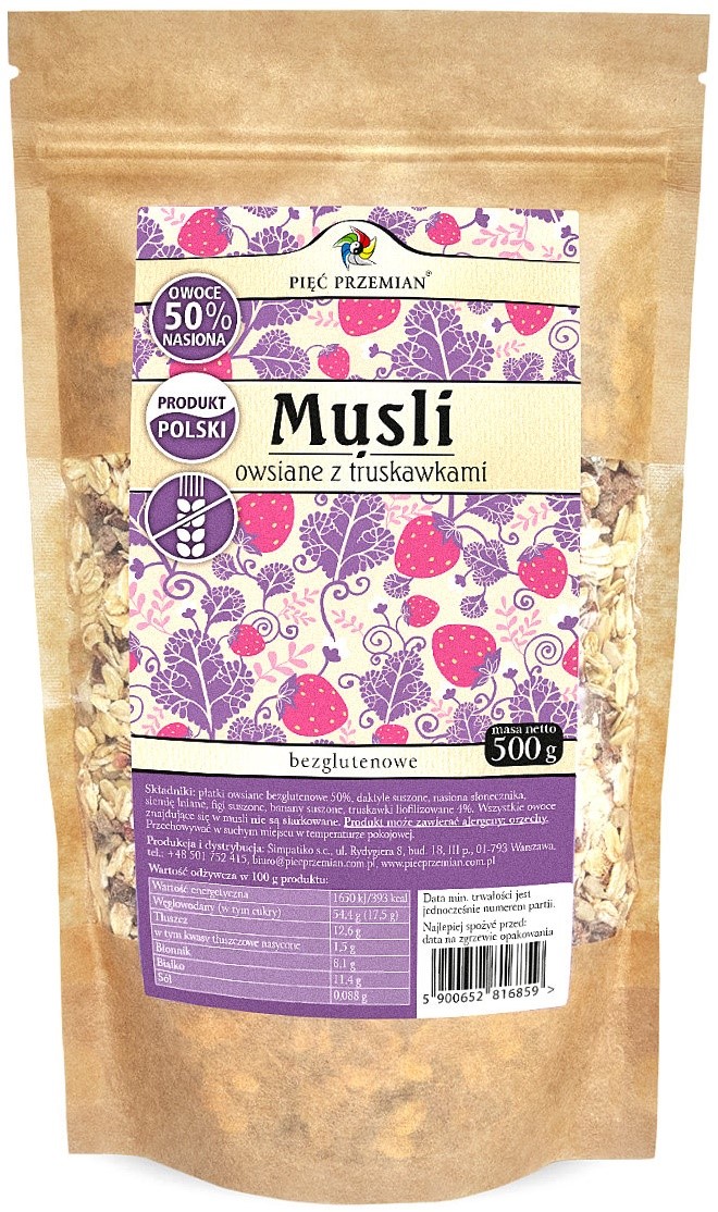 MUSLI OWSIANE TRUSKAWKOWE BEZ DODATKU CUKRÓW BEZGLUTENOWE 500 g – PIĘĆ PRZEMIAN